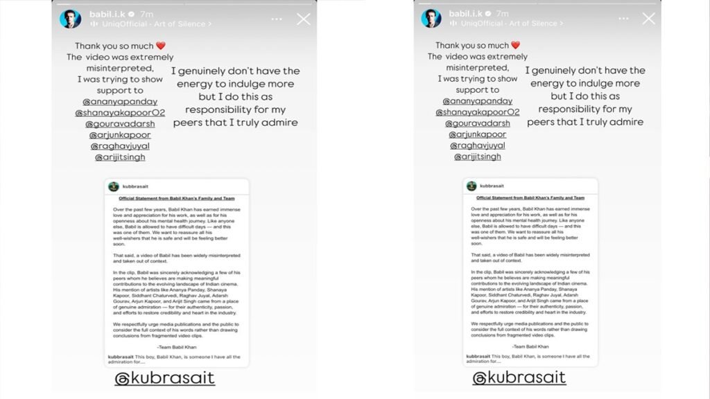 कुछ देर बाद बाबिल ने इंस्टाग्राम पर वापसी की और एक बड़ा clarification दिया। उन्होंने लिखा कि उनके वीडियो को गलत समझा गया है। जिन नामों का उन्होंने ज़िक्र किया, वो आलोचना नहीं बल्कि प्रशंसा थी। “मैं उनकी sincerity और originality को appreciate कर रहा था।”